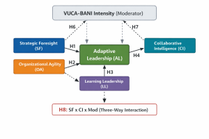 This study proposes and empirically tests an integrated adaptive leadership model that synthesizes four critical leadership capabilities: Strategic Foresight, Organizational Agility, Learning Leadership, and Collaborative Intelligence. The model aims to explain how these interrelated capabilities enable organizations to effectively respond to and thrive within VUCA–BANI environments.