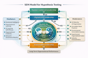 Mô hình SEM kiểm định giả thuyết nghiên cứu là một khung phân tích định lượng được sử dụng để đánh giá các mối quan hệ nhân quả giữa các biến trong một mô hình lý thuyết. SEM (Structural Equation Modeling) cho phép nghiên cứu đồng thời nhiều mối quan hệ giữa các biến tiềm ẩn (latent variables) và biến quan sát (observed variables), qua đó kiểm định mức độ phù hợp của mô hình lý thuyết với dữ liệu thực nghiệm. Khác với các phương pháp hồi quy truyền thống, SEM có khả năng phân tích các cấu trúc quan hệ phức tạp, bao gồm các hiệu ứng trực tiếp, gián tiếp, biến trung gian (mediators) và biến điều tiết (moderators). Trong nghiên cứu lãnh đạo và quản trị, mô hình SEM thường được sử dụng để kiểm định các giả thuyết về mối quan hệ giữa các năng lực lãnh đạo, hành vi tổ chức và kết quả hoạt động. Nhờ khả năng tích hợp phân tích đo lường và phân tích cấu trúc trong cùng một mô hình, SEM giúp tăng độ tin cậy và tính giá trị của kết quả nghiên cứu, đồng thời cung cấp bằng chứng thực nghiệm mạnh mẽ cho các khung lý thuyết đề xuất.